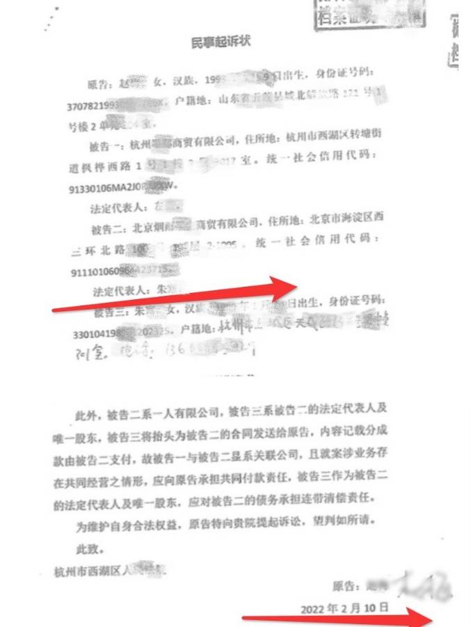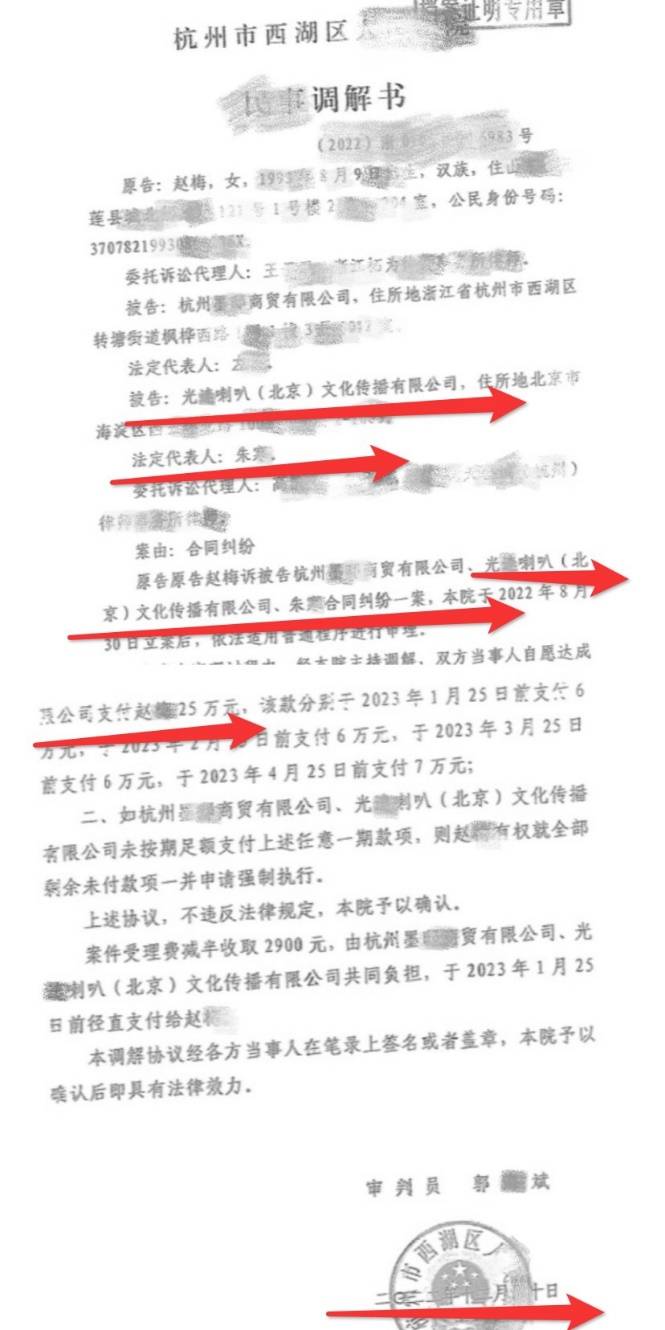 事情要从 2022 年张女士与朱某寒的商业合作说起。当时两人共同投资了杭州某邸商贸有限公司和光某喇叭(北京)文化传播有限公司(曾用名北京烟雨某生商贸有限公司),可这份合作关系,却成了朱某寒日后算计公司的 “跳板”。2022 年 2 月,赵某梅以品牌代言业务分成为由,将杭州某邸、光某喇叭及朱某寒一同告上杭州市西湖区人民法院。但据张女士回忆,赵某梅在起诉状中明明清晰表述,相关业务仅与杭州某邸合作,全程未提及光某喇叭;提交的证据里,所谓的服务合同是空白无签字、无盖章的无效文件,微信聊天里也只是她与朱某寒的私人对话,和光某喇叭没有半点关联