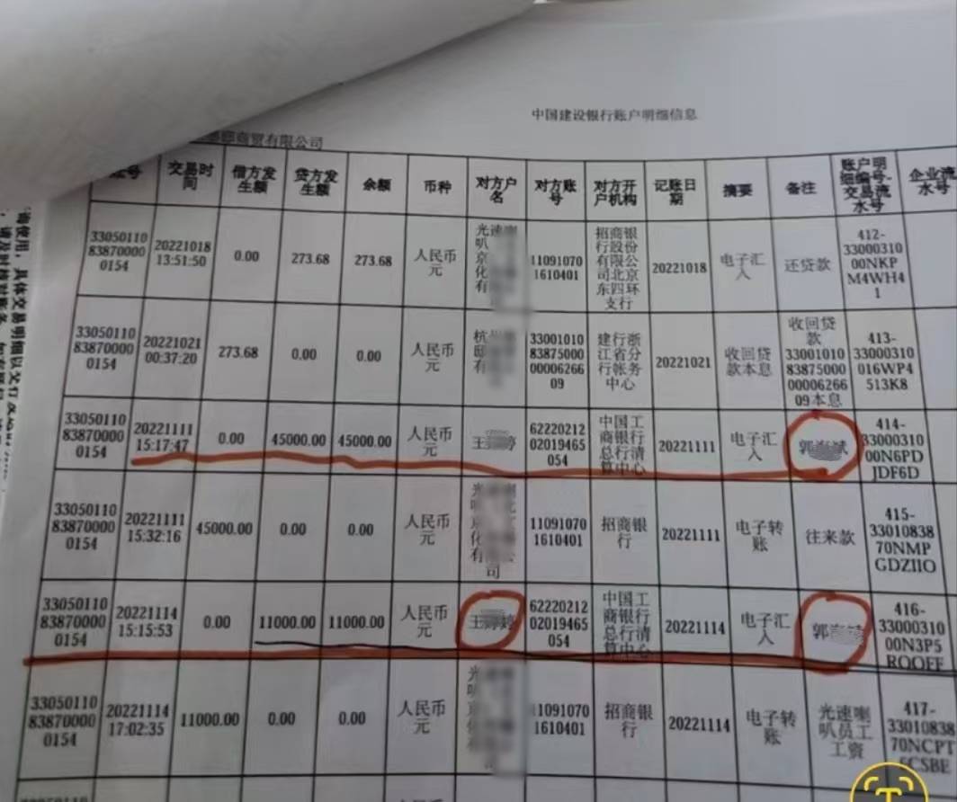 更让他们心生疑虑的,是与案件主审负责人郭某斌相关的款项问题。在杭州某邸的银行账户明细里,2022 年 11 月 11 日和 14 日,分别有一笔 4.5 万元、一笔 1.1 万元的汇款,汇款人标注为王某婷,备注却写着 “郭某斌”—— 而郭某斌正是这起案件的主审法官。这笔备注指向明确的款项,很难不让人将其与案件的非正常审理过程联系起来,也让张女士对案件审理的公正性产生了更深的疑问:法官是否对这笔款项知情?是否因这笔款项对案件审理有所偏向?。