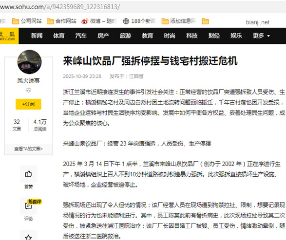 来峰山泉饮品厂的强拆事件与钱宅村村民的搬迁困境,都关乎当地群众切身利益。人们期待这些问题能妥善解决,让企业恢复正常经营,村民重拾安稳生活,历史文化村落也得到应有保护。