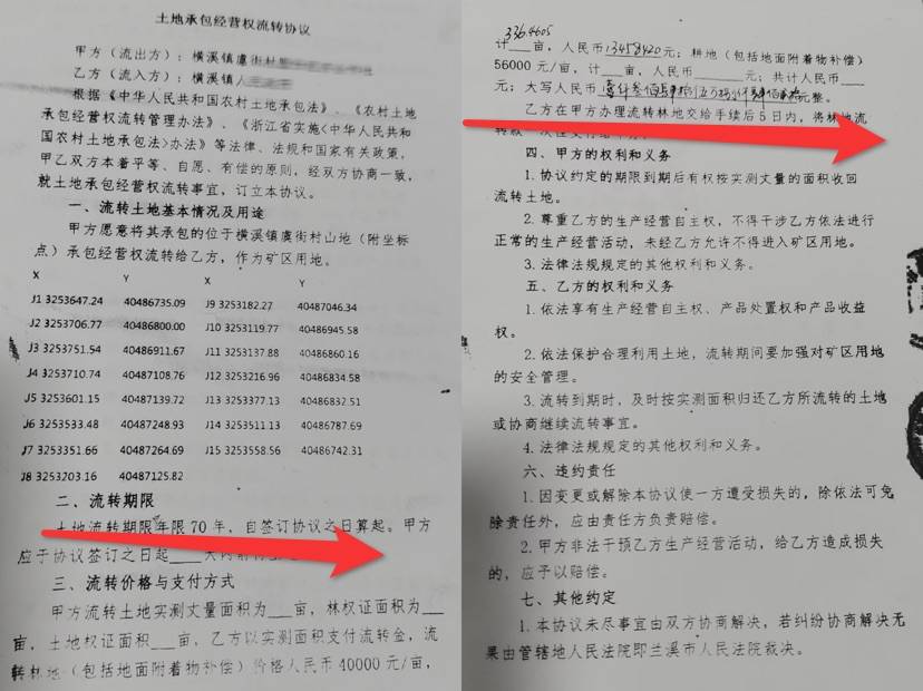 致诚矿产公司称,2021 年 9 月 7 日以 10.72 亿元竞得钱宅矿区矿地综合开发利用项目;横溪相关单位 2024 年 12 月 16 日给村民的书面答复也提到,该项目 “已通过兰溪市相关单位立项,矿权由致诚矿产公司竞拍合法获得”。但事实是,项目土地来源于 2021 年 3 月 18 日与虞某行政村签署的《土地承包经营权流转协议》。根据协议,虞某行政村将辖区内耕地、林地(按实际测量面积)以1345.84 万余元流转给镇相关单位,期限长达 70 年,随后这些土地被用于石矿开采。从法律层面看,我国明确规定耕地流转最长期限为 30 年,林地流转期限为 30 年至 70 年,且均不得超过土地承包经营权剩余期限;同时,土地经营权流转需坚持 “不改变土地所有权性质、不改变土地农业用途” 原则。此次 “以租代征” 70 年,并将农业用地转为工矿用途采矿,完全违背土地流转法规与原则,属典型不合规行为。